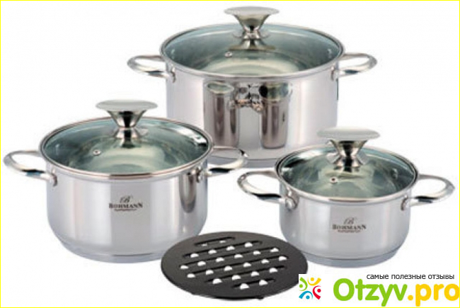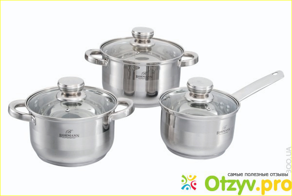 У данного набора посуды есть свои определенные преимущества - первое из них как уже было указанно выше - это нержавеющая сталь из которой сделан весь этот набор посуды, а также то что можно просмотреть все подробно на сайте данной продукции. У этого набора от фирмы Bohmann немецкое качество производства и конечно качество которое подтверждается множество сертификатов и наградами этой фирмы.