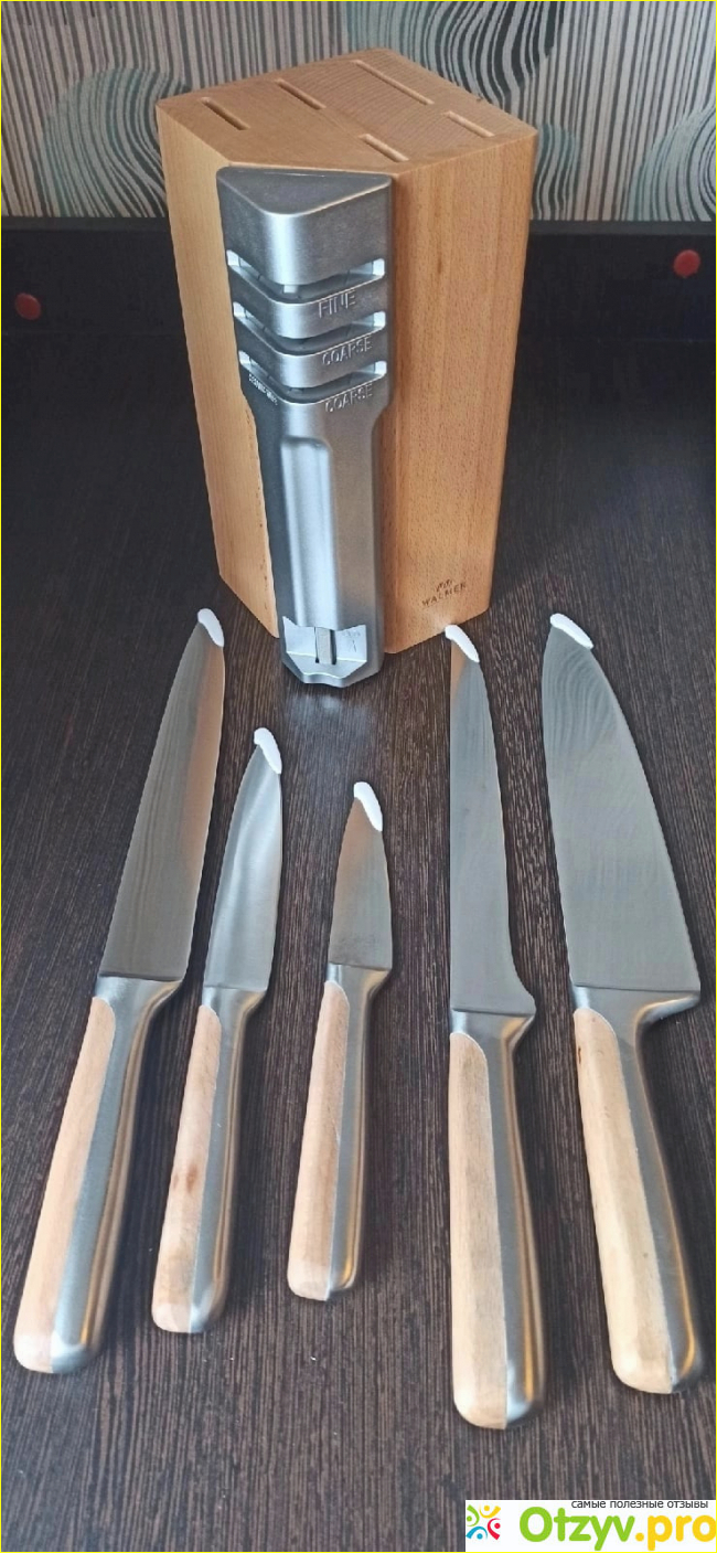 Я полностью довольна этими ножами, они острые, хорошо сидят в руке. Подставка красивая, главное не допускать попадания влаги. Ножи лучше тоже не оставлять мокрыми в мойке, так как деревянная часть ручки может отлететь. Стоимость набора небольшая-около три тысяч рублей. Такая цена полностью соответствует качеству товара. Ставлю этому набору 5 из 5