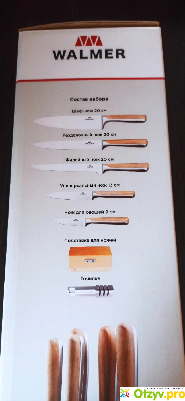 Набор состоит из 5 ножей разной длины, красивой подставки и точила.