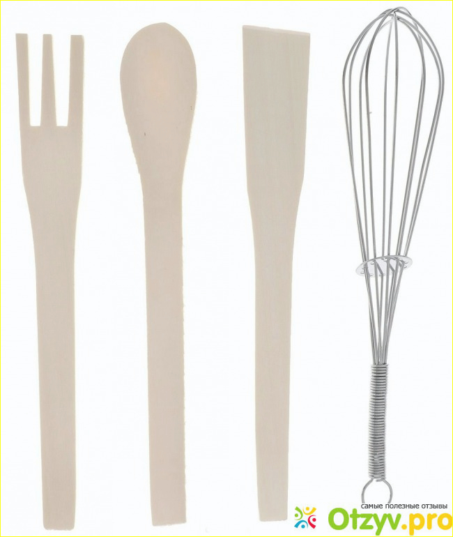 Как мне кажется, удобство данного набора заключается в том, что здесь есть различные предметы для удобства хозяйки - и лопатка, и ложка, и венчик с вилкой. Ведь так удобно готовить, когда все необходимое под рукой, да ещё и красиво оформлено.