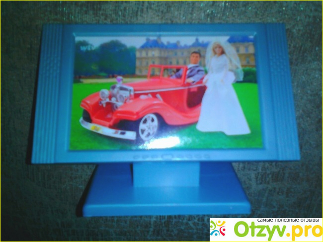 Телевизор- он достаточно большой, на подставке, с пультом управления. На дисплее приклеена картинка. Телевизор можно наклонять вверх и вниз.