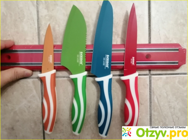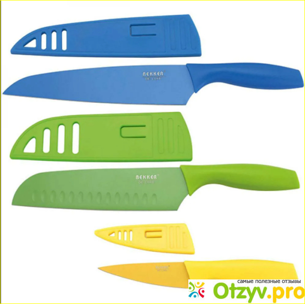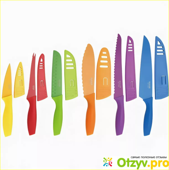 Шесть разных ножей входит в комплект — каждый из них выполнен в своем цвете. Удобно, когда все ножи — не только разные по назначению, но и по цвету.