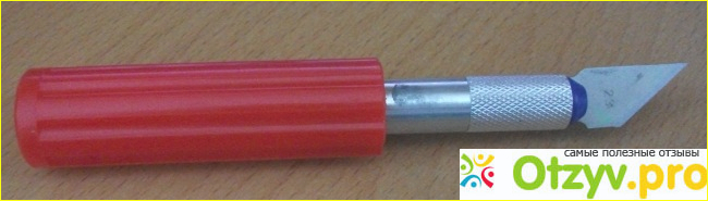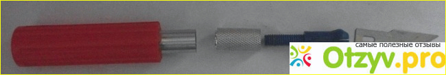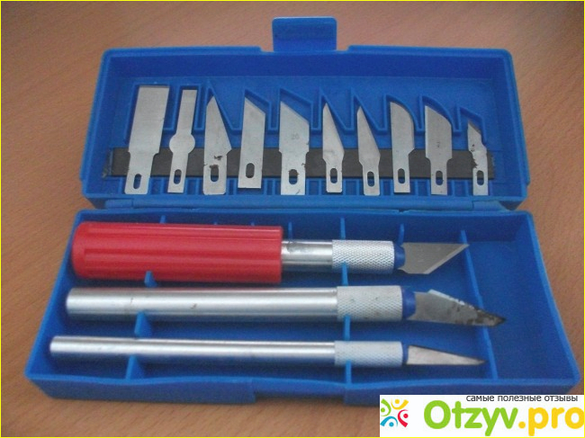 Сменные лезвия ножей, 10 штук, крепятся в верхней половинке корпуса на вкленном магните. Рукоятки ножей, 3 штуки, вставляются с натягом в специально предназначенные для них места нижней половинки корпуса. Ничего не вылетит и не потеряется при переноске, не придётся разбирать вывалившийся инструмент из кучи, как это часто бывает в плохо сконструированных наборах. Лезвия изготовлены из довольно качественной стали и очень острые. При работе необходимо соблюдать общеизвестные правила техники безопасности, иначе легко порезаться: не резать в направлении себя, не держать руки перед ножом, не резать на коленке, надёжно закреплять деталь и т. д.