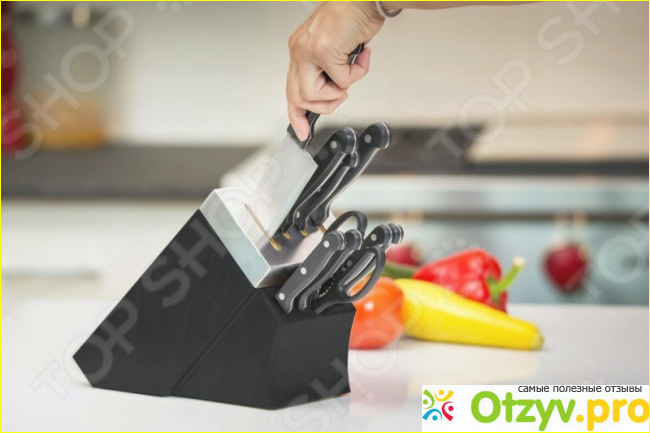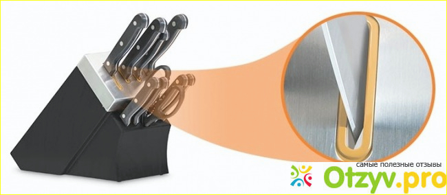 Особенность предмета в том, что заточка происходит каждый раз, когда лезвие вкладывается в держатель. Встроенный механизм есть в четырех отверстиях из восьми. Поэтому ножики всегда буду готовы к работе.