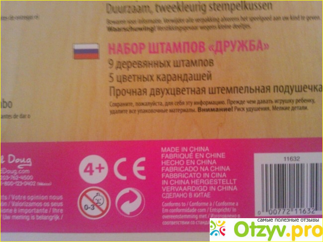 В состав входят 9 деревянных печатей с разными изображениями, пять цветных карандашей для раскрашивая этих печатей и лоток с чернилами двух цветов (фиолетовый и розовый). Качество и оформление очень порадовали, деревянные игрушки приятно держать в руках. Моя двухлетняя дочка вполне разобралась, как ставить печати самостоятельно. На наборе написано возрастное ограничение, он идёт от 4 лет, поэтому малыши должны играть под присмотром взрослых. Я покупкой очень довольна, дочка тоже, рекомендую.
