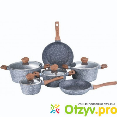 В первую очередь хочу отметить, что этот набор выглядит очень классно. Я сперва даже и не поняла из какого материала он сделан. Так как сама расцветка у него идет по гранит. А оказалось, что выполнен этот набор посуды из кованного алюминия. А сверху он покрыт мраморно-гранитным покрытием. Как раз именно это покрытие и придает набору посуды такой интересный и довольно дорогой вид.