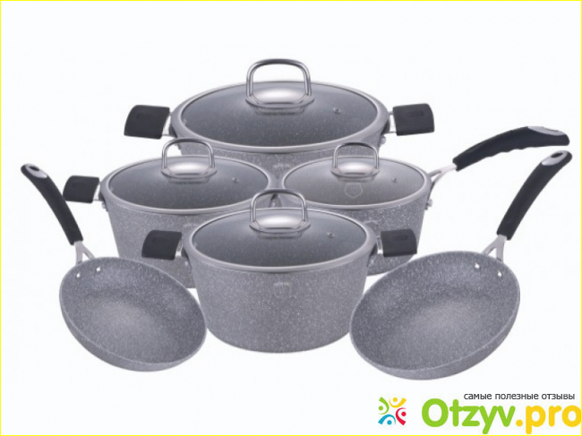 Самое главное, что отличает этот комплект посуды – это мраморное покрытие, которое придает ей величавый вид. Кроме дизайнерского смысла, это покрытие еще отлично защищает основной металл, из которого изготовлена посуда, от естественного износа в процессе пользования.