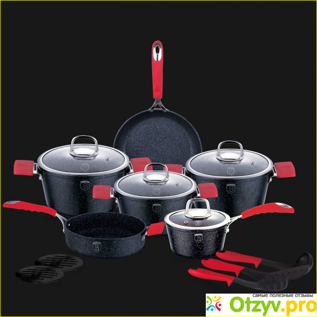 В наборе имеется пятнадцать предметов, среди которых – три кастрюли разного объема и диаметра, подходящие для всех случаев, которые только возможны в кухонных обстоятельствах, ковшик на 1, 2 литра, очень удобный для ежедневного пользования, две сковороды различного диаметра, с довольно высокими бортиками, 4 крышки, две бакелитовые подставки, ложка для спагетти, лопатка и половник.