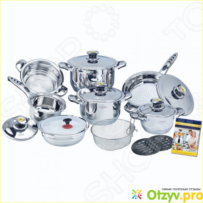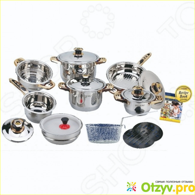 Набор состоит из 19 предметов, каждый из которых просто необходим на кухне: 3 кастрюли с крышкой разных размеров, ковш, дуршлаг, сотейник, ручка-присоска вакуумная, корзина с ручкой для фритюрницы, 2 подставки под горячие блюда, контейнер с крышкой для хранения еды. Еще меня порадовал небольшой подарок – книга рецептов. Благодаря ей я готовлю различную пищу и придумываю новые блюда.