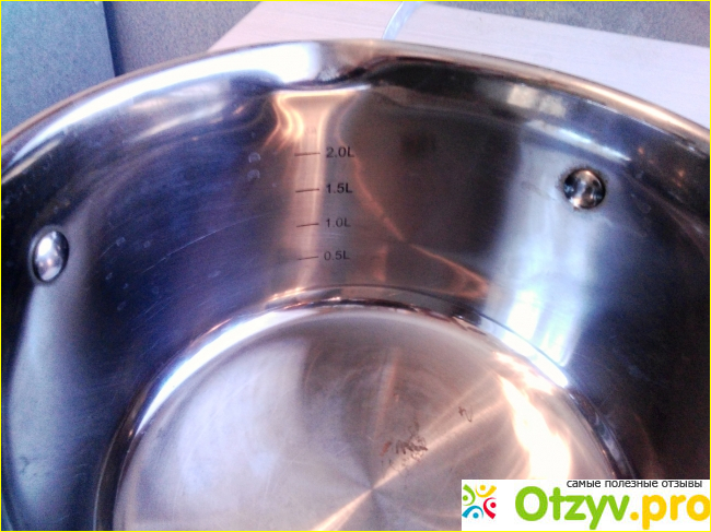 Внутри кастрюль имеется мерная сетка, то есть шкала, по которой вы сможете отмерять точное количество воды (жидкости), заполняя кастрюлю. Так вы отмерите все максимально точно и не будете отходить от рецептуры. Не нужно наливать сначала воду в банку, а после переливать. Отмерять жидкость можно теперь прямо в кастрюле.