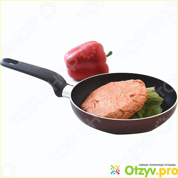У всех сковород и сотейника имеется антипригарное покрытие со знаменитым кружочком внутри. Когда сковорода максимально разогрета кружок становится красным. Это отличительная особенность Тефаль.