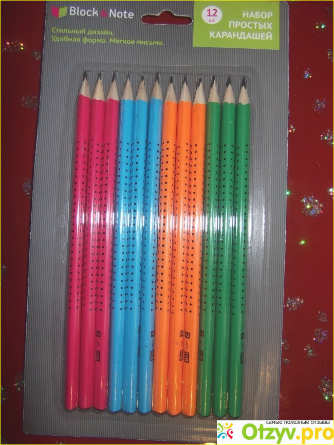 Все карандаши различных цветов, можно использовать под настроение. Причем краска, которой они обработаны не остается на пальцах и не осыпается при затачивании грифеля. Форма у карандашей многогранная, что способствует удобному письму или художеству, так как карандаш не выскальзывает из рук. Сам карандаш деревянный, а значит экологически чистый. Мне конечно очень понравился в меру мягкий и яркий грифель, он просто прекрасно ложится на бумагу, и легко стирается при необходимости, не оставляя грязных следов. При затачивании простые карандаши очень ровно и хорошо точатся, не крошатся, что свидетельствует о хорошем качестве грифеля.