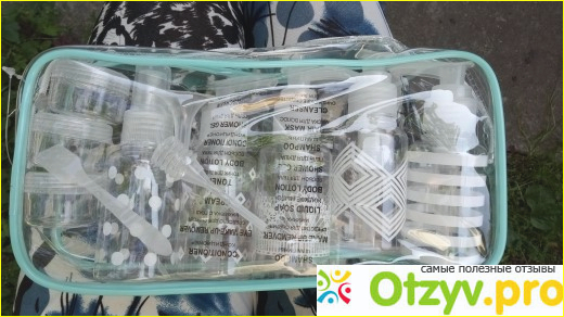 Все бутылочки и баночки упакованы в удобную прозрачную косметичку на молнии. Она поместится как в сумку, так и в чемодан для ручной клади.