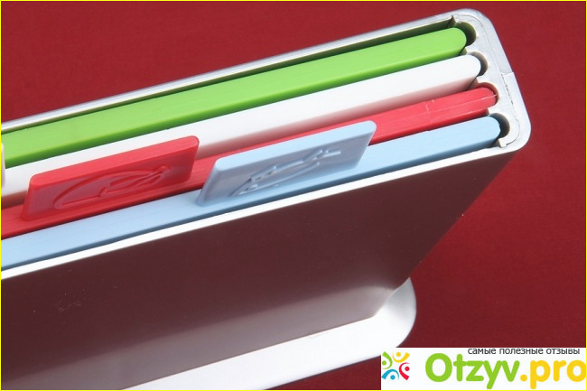 Всего в наборе идет четыре разноцветные доски, которые выполнены из пластика. Но и это еще не все, для удобства с одной стороны на каждой доске есть специальный квадратик на котором нарисован тот продукт, который вы будете резать на этих досках.