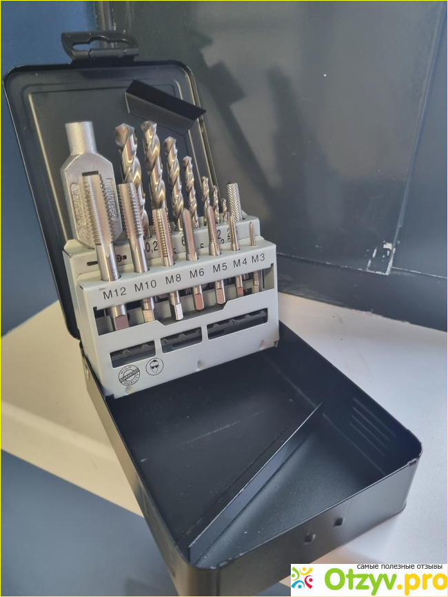 В наборе как раз присутствуют самые ходовые размеры. Метчиков 7 штук, размеры 1 x M3 - M4 - M5 - M6 - M8 - M10 - M12. Сверл тоже 7 и размеры соответствуют размерам метчиков, 1 x 2.5 - 3.3 - 4.2 - 5.0 - 6.8 - 8.5 - 10.2 мм.
