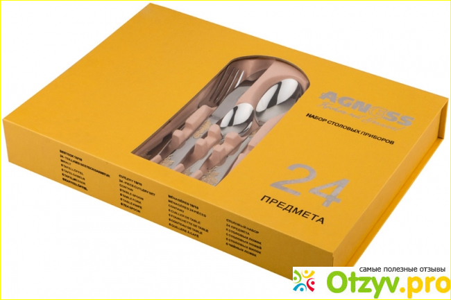 Красиво упакован, вполне может быть подарочным — набор столовых приборов agness 922-126 поставляется в симпатичной коробочке. Она, так же, еще и дополнительно завернута в несколько упаковок и целлофан.