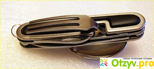 Нож, открывалка для консервов и бутылок, ложка и вилка очень легко, но с натягом и фиксацией, вытаскиваются из корпуса, для этого одну из этих рабочих частей достаточно потянуть на себя. Для удобства, рабочие части оборудованы специальными углублениями на металле, а на корпусе для вытаскивания вилки и ножа есть специальные вырезы.