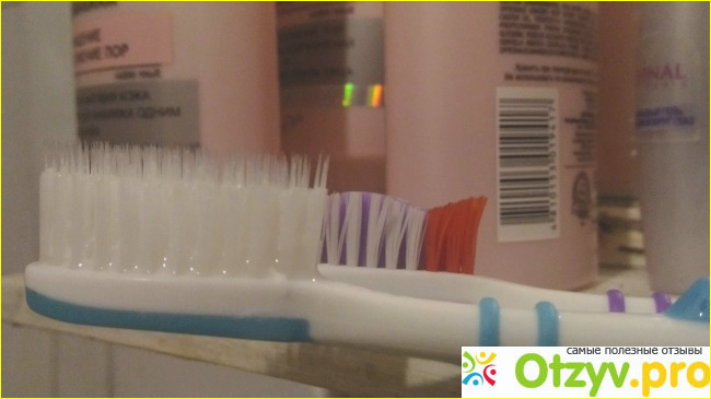 На фотке для сравнения - тоже щетка White Glo, но из обычной коробочки с отбеливающей пастой. Там видно, что ничего не торчит, как из колоса, и она горааздо комфортней.