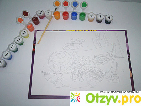Как правило, наборы идут в симпатичных упаковках, внутри которых находится холст на подрамнике, на котором изображен рисунок, разделенный на множество мелких зон. Каждой зоне соответствует отдельная цифра, а ей – пронумерованная баночка с краской. Плюс – несколько кисточек различной толщины. Все что вам понадобится своего – это баночка с водой!