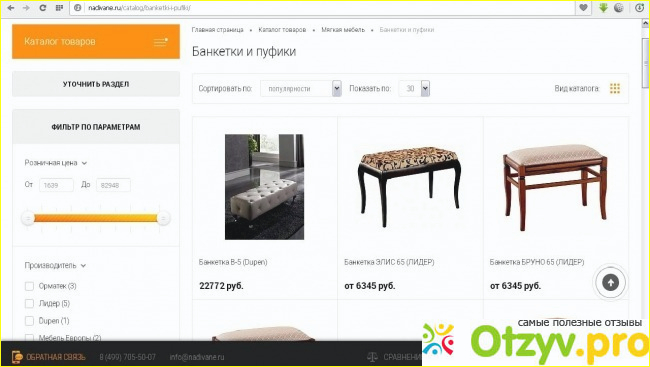 Слева открывается фильтр. В первую очередь это цена. И цены, скажем, вполне человеческие. Вот банкетки, к примеру, стартуют у них от 1639 рублей. Это же вполне доступная цена. А за 83 тысячи рублей пусть уже самые богатые смотрят.