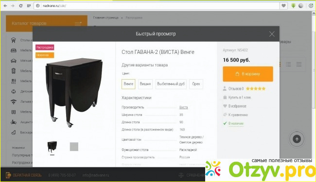 Чтобы просмотреть товар достаточно щелкнуть на его изображение. Справа указан артикул, цена и предложение осуществить покупку. Слева виды товара с разных сторон, которые можно пролистывать. А вот в центре основная информация по товару: размеры, цвет, какие-то функции, а так же производитель. К сожалению, я щелкала на цвет, а картинка со столиком не менялась вовсе. Хотя есть зелёная птичка с надписью "В наличии" на всех цветах. Да и видов мало, всего два. И то один - какой-то квадрат. На других товарах всё работало.