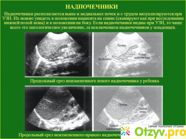 УЗИ надпочечных желез отличаются от обычного ультразвукового исследования других органов и систем своеобразными сложностями. Так как надпочечники плохо доступны, это связано с естественными анатомическими особенностями человеческого организма. На самом же деле хорошо визуализируются, только расположения надпочечников. Иногда УЗИ бывает показывает сами сосуды надпочечников, но так бывает далеко не всегда. В основном же, сосудистая сетка видна лишь при ее воспалении. И об изменившейся форме надпочечников, может также говорить деформация соседних внутренних органов. Так что, если это есть, то значит и надпочечники увеличены, и страдают от этой опухоли. Поэтому лучше не запускать эту болезнь и регулярно проверяться у врача, чтобы такое заболевание не привело к осложнениям.