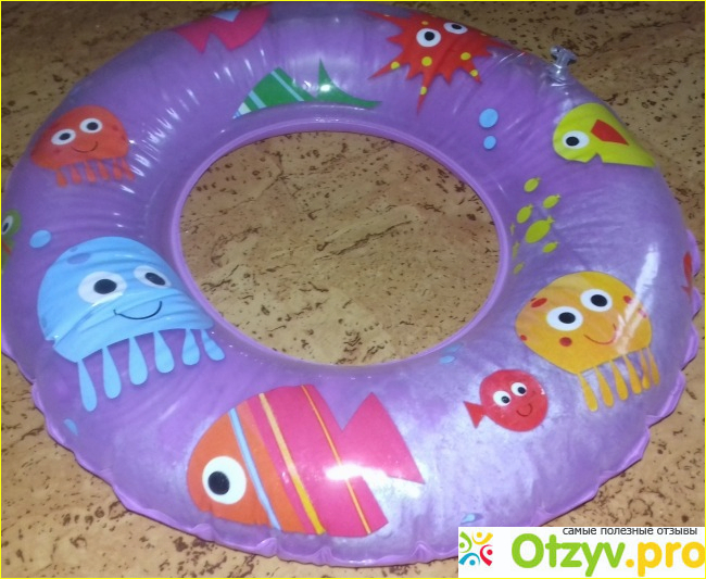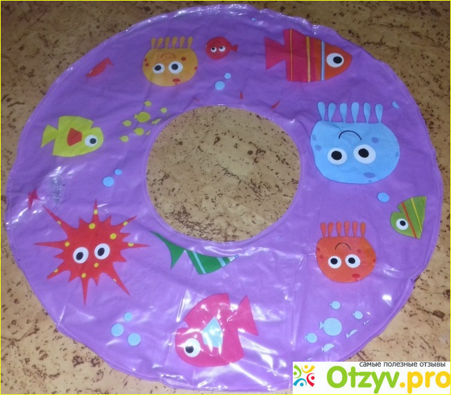 Расцветка у круга веселенькая - ярко-фиолетовый цвет и по всему кругу на лицевой поверхности нанесены яркие рисунки рыбки, медузы, морские звезды, желтого, оранжевого, красного, розового, голубого и зеленого оттенков. Рисунки тоже качественно нанесены, не стираются от воды и от манипуляций различных.