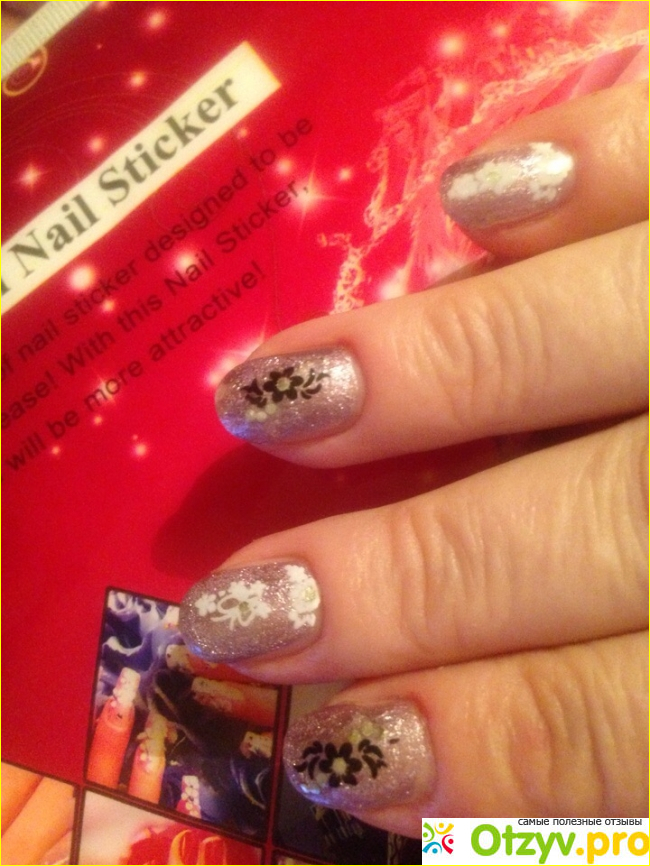 Наклейки маленькие, работать с ними удобно даже новичкам, можно совмещать по две-три картинки совместно. На стикерах есть блестки, которые очень хорошо имитируют стразы, но не создают дискомфорта при носке. Держатся наклейки около двадцати дней, возможно и больше, но я часто меняю покрытие. Удалить с ногтя их легко-обычным средством для снятия лака.