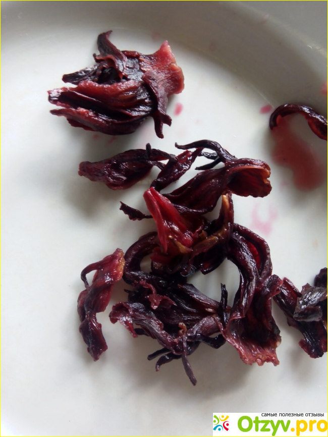 Это большие лепестки и попадаются целые соцветия, красивого яркого цвета. Которые при заваривании придают красивый цвет напитку, цвет чая сразу становится чёрным, а потом лепестки выделяют краску.