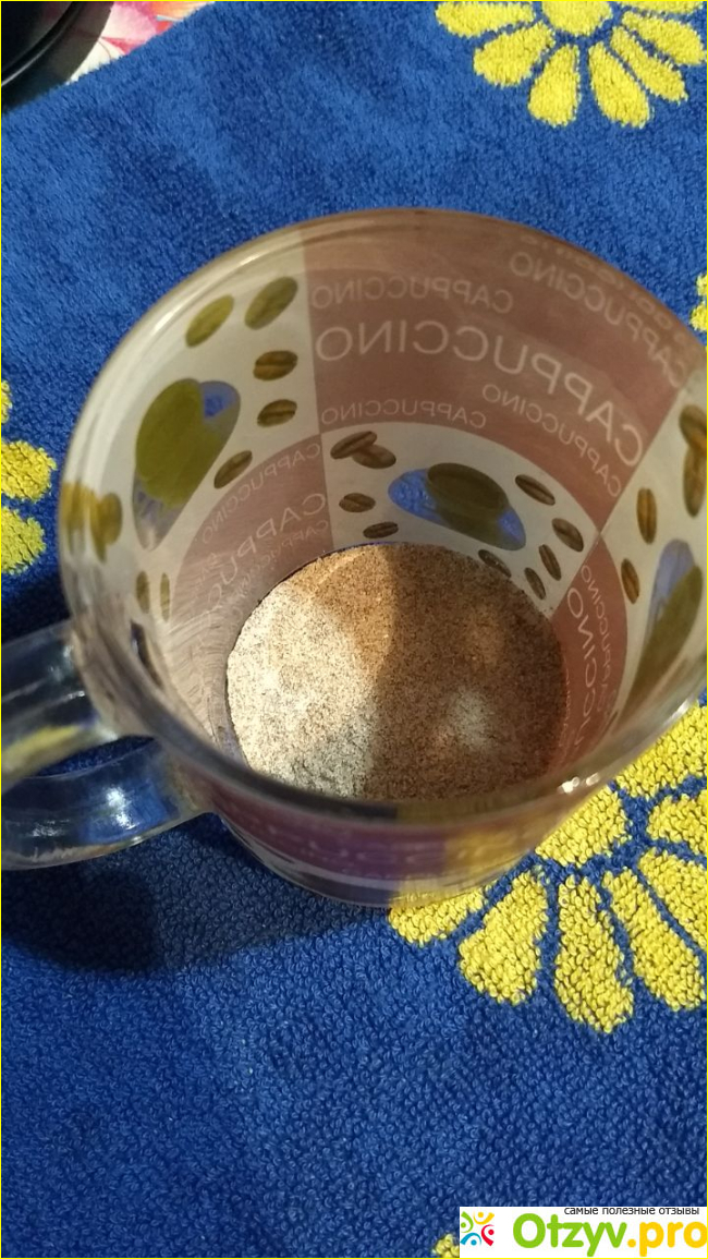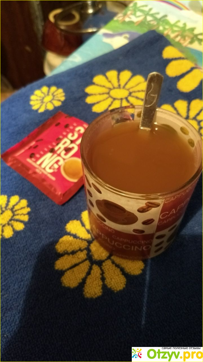 Я заливаю содержимое пакетика кофейного напитка 150г кипятка, тогда вкуснее получается. Цвет заваренного продукта светло-коричневый.