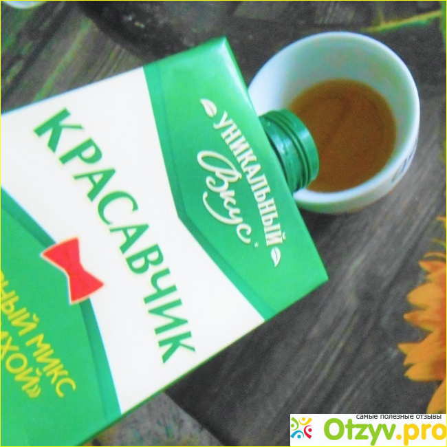 Пришла я из магазина домой, достала тетрапаковскую упаковку «Красавчика», взболтала ее содержимое и налила себе стаканчик. Напиток действительно имеет янтарный цвет. Он будет очень аппетитно смотреться на столе в стеклянном графине. Впрочем, упаковка тоже красивая.