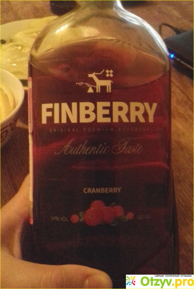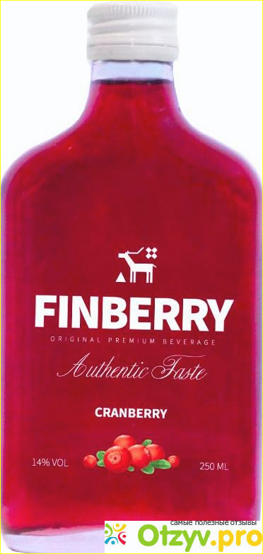 На лицевой стороне бутылки имеется прозрачная пластиковая этикетка. На ней сверху вниз изображено -олень, по всей видимости финский, если судить по названию. Далее крупными белыми буквами написано - finberry. Также на бутылке нанесена информация какой вкус имеет данный винный напиток, в данном случае клюквенный вкус имеет данный напиток.