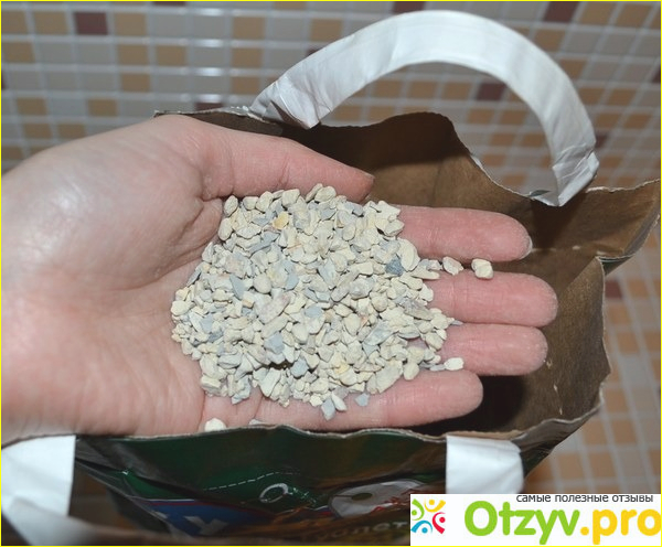 Пачка такого наполнителя стоит порядка 75 рублей за пакет объемом 4,5 литра. Наполнитель изготовлен из опоки. Внешне это почти тоже самое, что бентонитовая глина, используемая в большинстве современных наполнителей, - мелкая щебеночка серого и даже немного зеленоватого цвета.