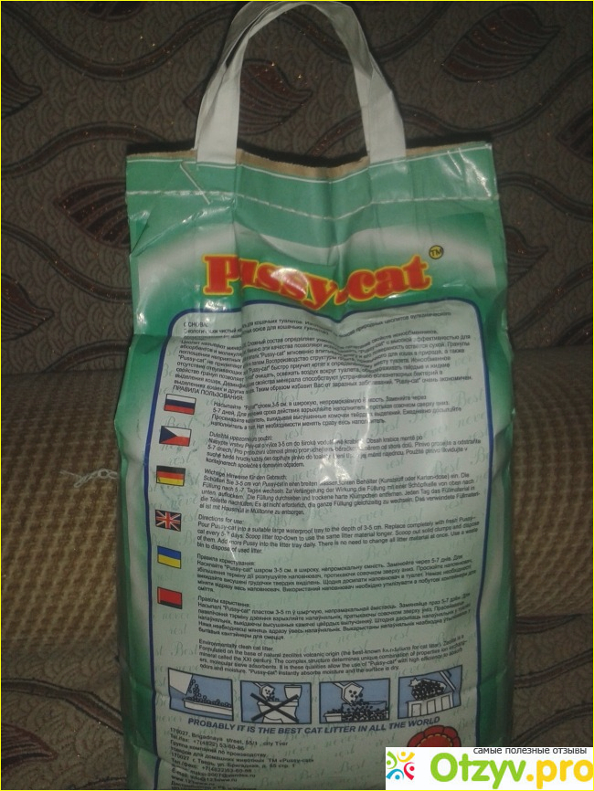На обратной стороне упаковки можно прочесть информацию о том, из чего сделан данный наполнитель. Это натуральный природный материал. Сделан он из природных циолитов вулканического происхождения. Этот материал обладает высокой впитываемостью и действует на молекулярном уровне. Именно за счет этого запах мочи совсем не чувствуется. Во всяком случае он не доступен человеческому обонянию. Конечно же, когда начинаешь менять наполнитель и приходится наполнитель ворошить, запах появляется и весьма сильный. Но этот неприятный момент вполне компенсируется отсутствием непритяного запаха кошачьих продуктов жизнедеятельности в квартире.