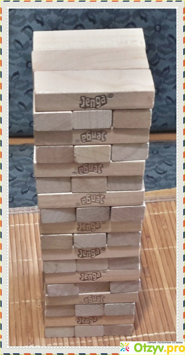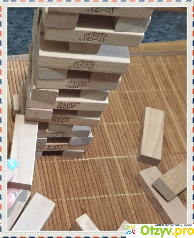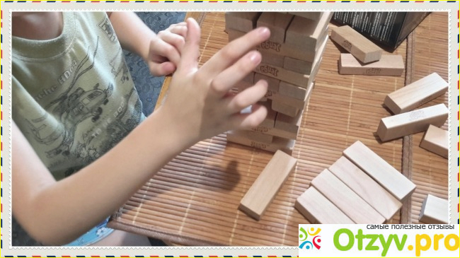 Смысл игры состоит в том, что после того, как сложишь из таких деревянных блоков башню, надо осторожно извлекать из этого строения по одному блоку так, чтобы вся конструкция не разрушилась.