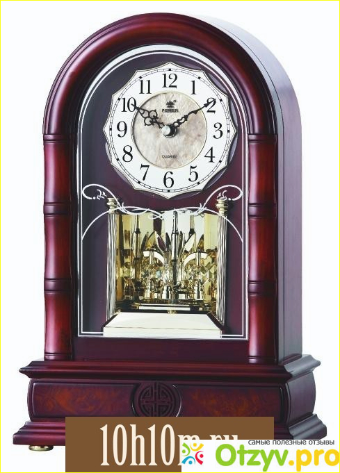 Часы в деревянном корпусе из красного дерева. Циферблат очень красивый, стрелки с завитушками. Механизм бесшумный и не привлекает к себе внимания. Под циферблатом находится маятник. Часы работают от батареек, но это ничуть не мешает и не умаляет достоинств этих часов. Очень красивая мелодия и яркий, звонкий бой (даже не смотря на то, что это небольшие часы). Есть автоматическая функция отключения мелодии на ночь, что очень упрощает пользование часами, т. к. не нужно отключать самостоятельно или слушать звон по ночам.