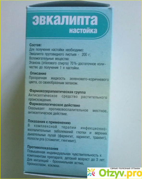 Помимо наличия спирта в настойке эвкалипта содержится дубильные вещества. флавоноиды, эфирные масла, растительные кислоты, и смолистые вещества. Настойку эвкалипта, неплохо сочетать и с эфирным маслом эвкалипта. Она неплохо зарекомендовала себя как отличное противопростудное средство. В этом случае ее можно использовать в виде ингаляций. подойдет как эфирное масло, так и настойка эвкалипта В ингалятор для лечебного эффекта достаточно будет капнуть несколько капель настойки эвкалипта. А также можно попробовать настойку в качестве вспомогательного средства при заболевании верхних дыхательных путей. Такой настойкой также можно полоскать горло Развести несколько капель пятнадцать или двадцать в стакане теплой кипяченой воды и прополоскать горло. Настойка эвкалипта будет влиять на болезнетворные бактерии и постепенно вместо с лекарственными средствами будут заметны улучшения состояния.