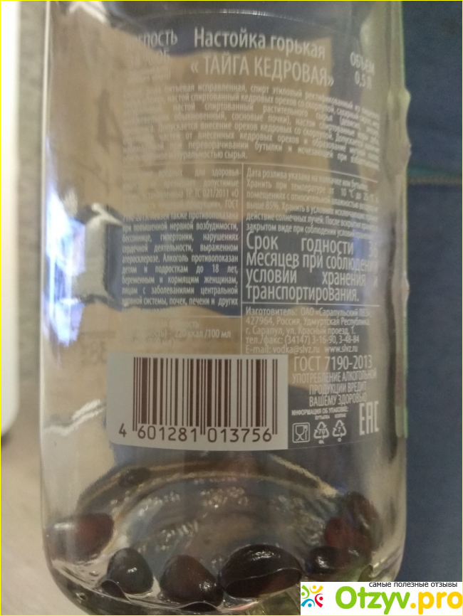Обратную этикетку специально сфотографировал пустой, чтобы иметь возможность показать читателям наличие настоящих кедровых орешков в скорлупе на дне бутылки.