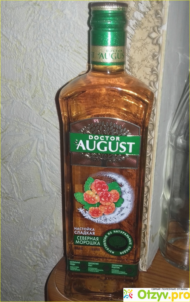 Выпускается данная сладкая настойка Doctor August "Северная морошка" в самой обычной бутылке, как у любых крепких алкогольных напитков. Данная бутылка имеет самую простую форму - она прямоугольная и с коротким горлышком узким. Вот даже не помню сейчас есть в данной бутылке дозатор или нет, но вроде есть, потому как данный напиток при разливе по бокалам не разливался мимо.