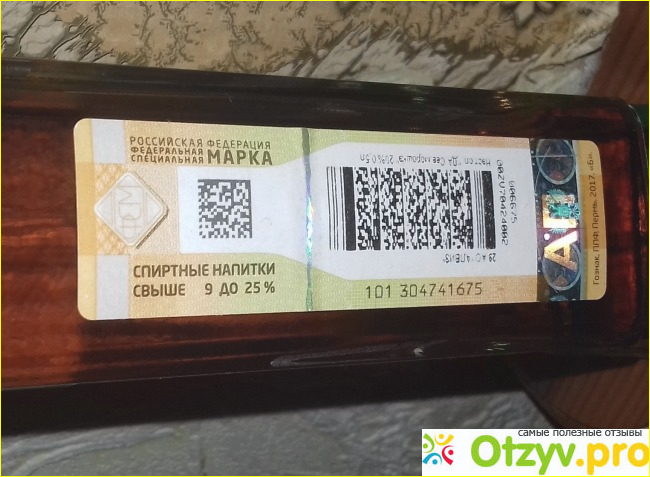 Сбоку на бутылке имеется акцизная марка, на ней указано, что такая клеится на напитки с алкогольностью от девяти до двадцати пяти процентов, то есть, всегда надо следить, чтобы и марку пробивали, это будет подтверждением тому, что напиток не поддельный.