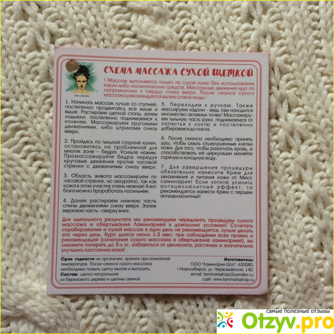 При покупке к щетке на натуральную верёвочку была прицеплена небольшая инструкция по применению. На ней можно видеть, что схематично показано, как нужно проводить массаж, по каким линиям и в какую сторону. Помимо этого есть словесная инструкция, которая поможет сделать массаж действительно качественным.