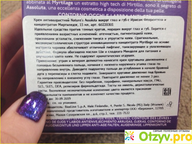 Этот крем помогает моей коже, предотвратить появление «гусиных лапок», отеков и темных кругов под глазами, а так же питает и ухаживает за кожей вокруг губ.