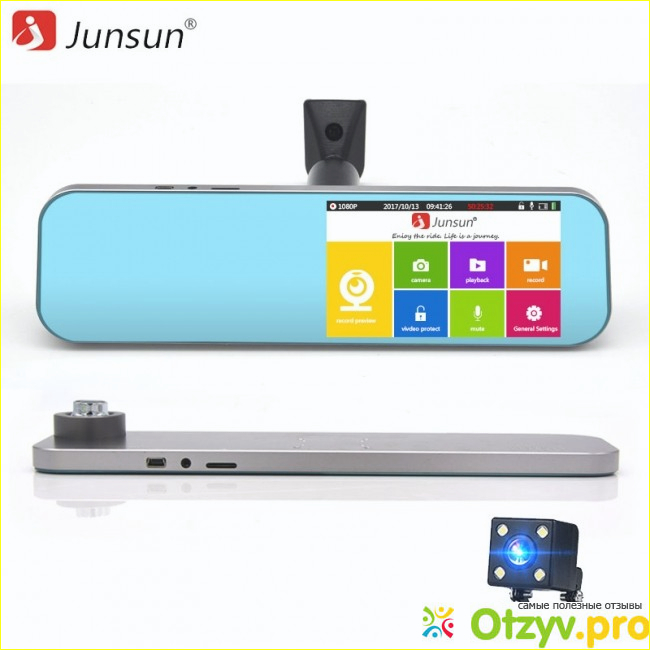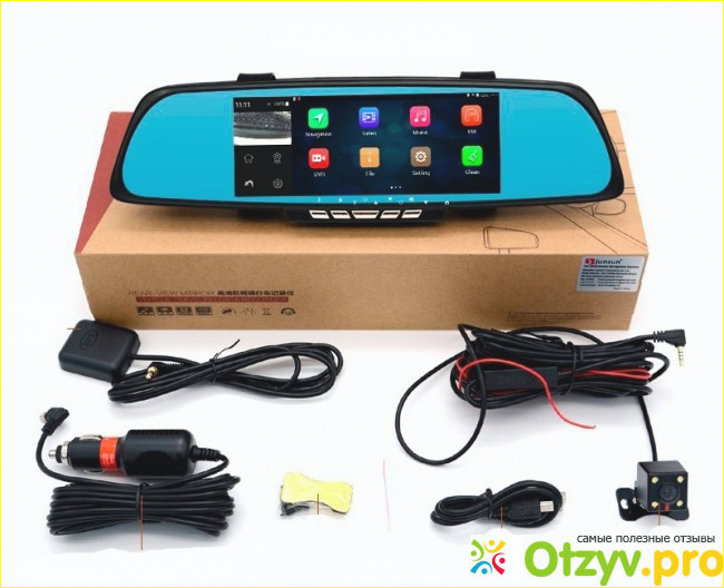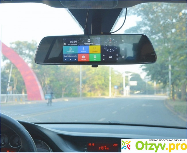 Первым делом я хочу отметить внешний вид устройства, дизайн в виде зеркала, которое легко устанавливается на лобовое стекло. После включения устройства, справа будет отображаться время и дата, а слева будет собственно интерфейс с меню. Все на русском языке, работает устройство на операционной системе Андроид 5.0. Экран довольно габаритный по диагонали и составляет 7 дюймов, разрешение экрана отличное. К тому же надо отметить, что видеорегистратор позволяет записывать вид как спереди, так и сзади. Угол обзора камер составляет 160 градусов, но вот к сожалению задняя камера не выдает нужный обзор.