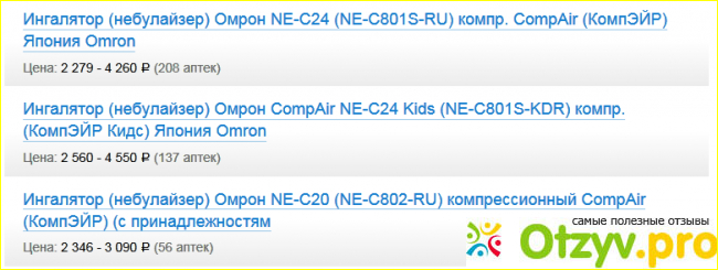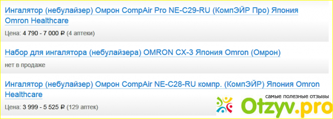 Из таблицы видно, что, кроме габаритов, модели практически схожи. Немаловажную роль в выборе ингалятора играет цена. Это просто замечательно, если в вашем городе есть сайты сравнения цен на лекарства по городу! У нас таких несколько, и вот так наглядно можно посмотреть разброс цен на небулайзеры Омрон: