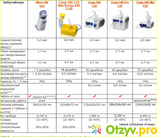 Для сравнения характеристик моделей небулайзеров ингаляторов Омрон можно воспользоваться следующей таблицей: