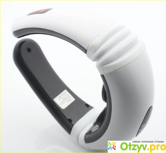 Коробка небольшая картонная. Внутри массажер. Внешне он чем-то похож на очки или наушники, но значительно толще. Одевается на шею также как беспроводная гарнитура. Получается такой широкий валик, который обхватывает шею сзади. Цвет у массажера белый снаружи и черный внутри. Довольно стильно и не пачкается. Состоит валик как бы из трех частей: задняя с двумя электродами внутри и два передних ушка, присоединенных на подвижных сочленениях, что позволяет их раздвигать в стороны и одевать прибор на шею. В комплекте еще идут два магнита на проводах. Их можно подсоединить к основным магнитам на приборе и поставить на спине, чтобы одновременно с шеей массировать и спину.