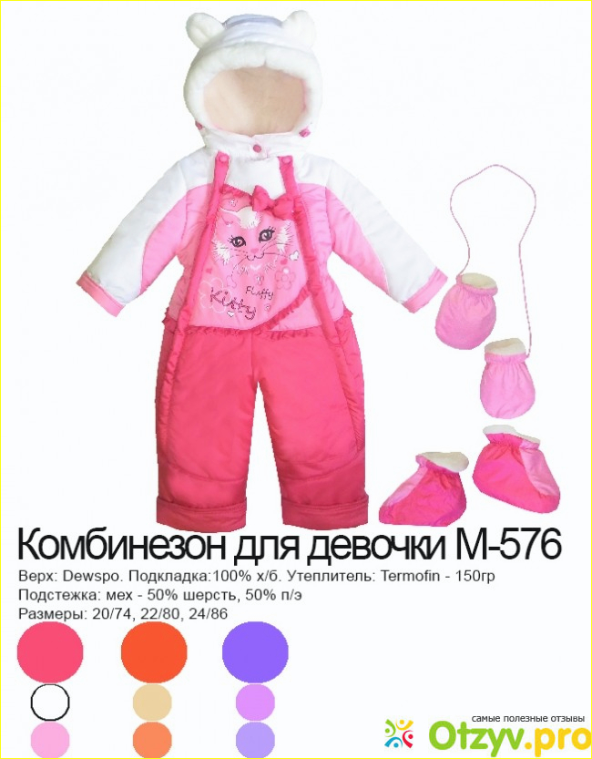 Так как нам надо было для первой зимы, выбрала самый маленький размер - 74. Цвет с сине-фиолетовым оттенком. Очень нарядный и красивый комбинезон с милым котиком. Есть утеплитель всего 150 грамм, поэтому можно носить весной и осенью. А на зиму уже носить вместе с подстежкой. В комплекте есть варежки и пинетки. Шея полностью закрывается. застегивается на кнопочку.
