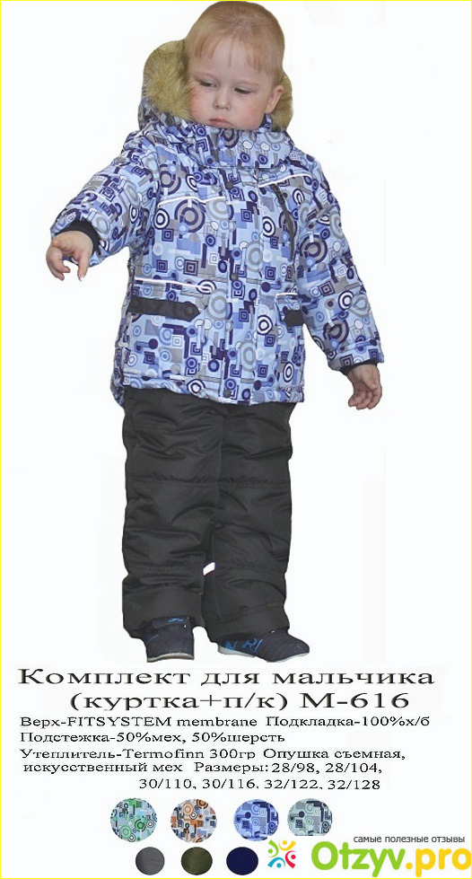 У нас был вот такой комплект. В комплекте куртка и полукомбинезон. Подстежка 50% из мехе и 50% из шерсти. Очень теплая. Мне еще нравится, что на рукавах есть резинки: не попадает снег во время игр и не продувает. В первый год мы подворачивали рукава и низ брюк. А во второй год просто так. Это все продумано. Поэтому, если ребенок резко не выростет, то спокойно данный вещи можно носить по два года.