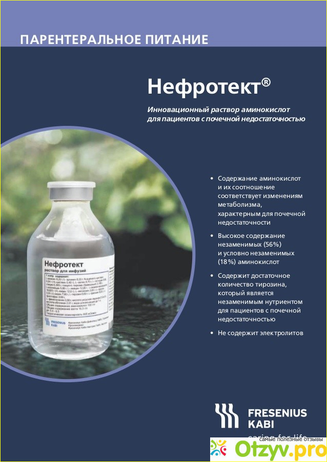 Раствор разработан для искусственного питания пациентов в условиях стационара, а также можно использовать его и в домашних условиях. Нефротект полностью покрывает суточную потребность организма в жидкости и питательных компонентах.