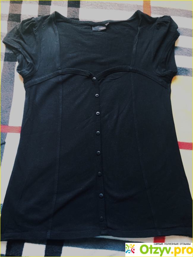 Блузку я тоже брала в черном цвете - моем любимом. По сути это футболка, но женственная - с довольно глубоким вырезом, на планке-обманке с пуговицами. Смотрится очень мило.